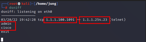 arp-spoofing 공격 당한 상태에서 GW에 telnet을 열어주고 telnet 접근을 한다.