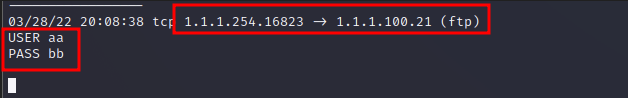 1.1.1.254 에서 1.1.1.100으로 FTP 접속 했다는것과 접속을 위해 친 ID와 PW가 뜬다.