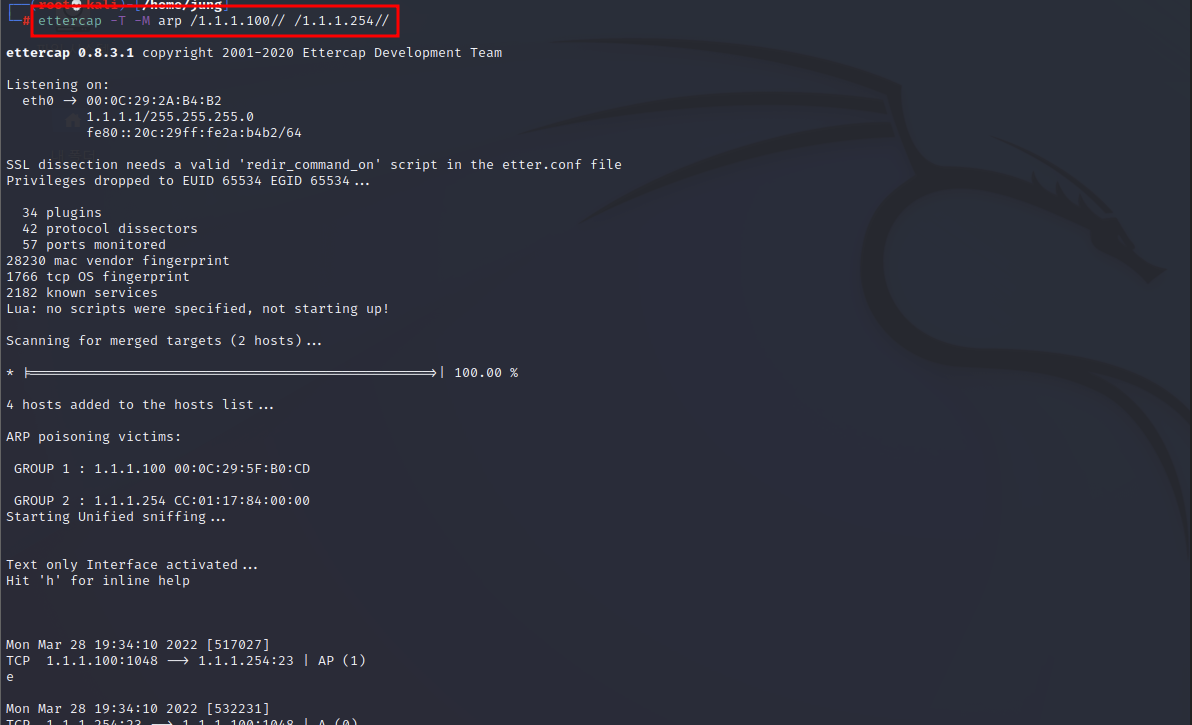 ettercap -T -M arp [/타겟IP//] [/변조할 IP//]