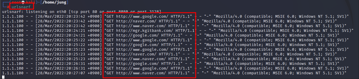 추가로 Dsniff에 포함된 툴로 Urlsnarf를 통해 타겟PC가 접속한 웹사이트를 확인이 가능하다.