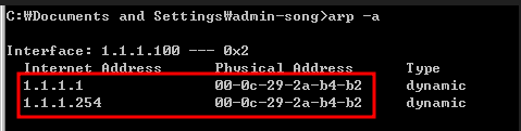 타겟PC에 arp table을 확인해보면 arp-spoofing으로 인해 게이트웨이인 1.1.1.254와 1.1.1.1인 Kali와 Mac주소가 같다.