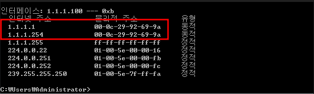 타겟PC인 Win7에 arp table을 확인해보면 게이트웨이와 공격자PC의 MAC address가 같아진걸 볼 수 있다.