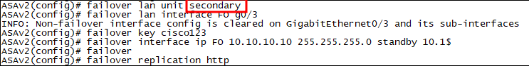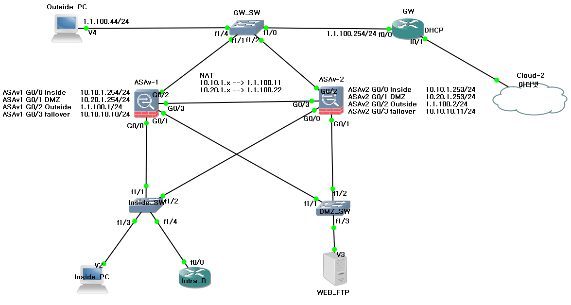 failover lan unit secondary 이후 모든 설정을 ASAv1에 설정했던것과 똑같이 설정을하게 되면 ASAv1의 설정이 ASAv2에 적용되게 됩니다