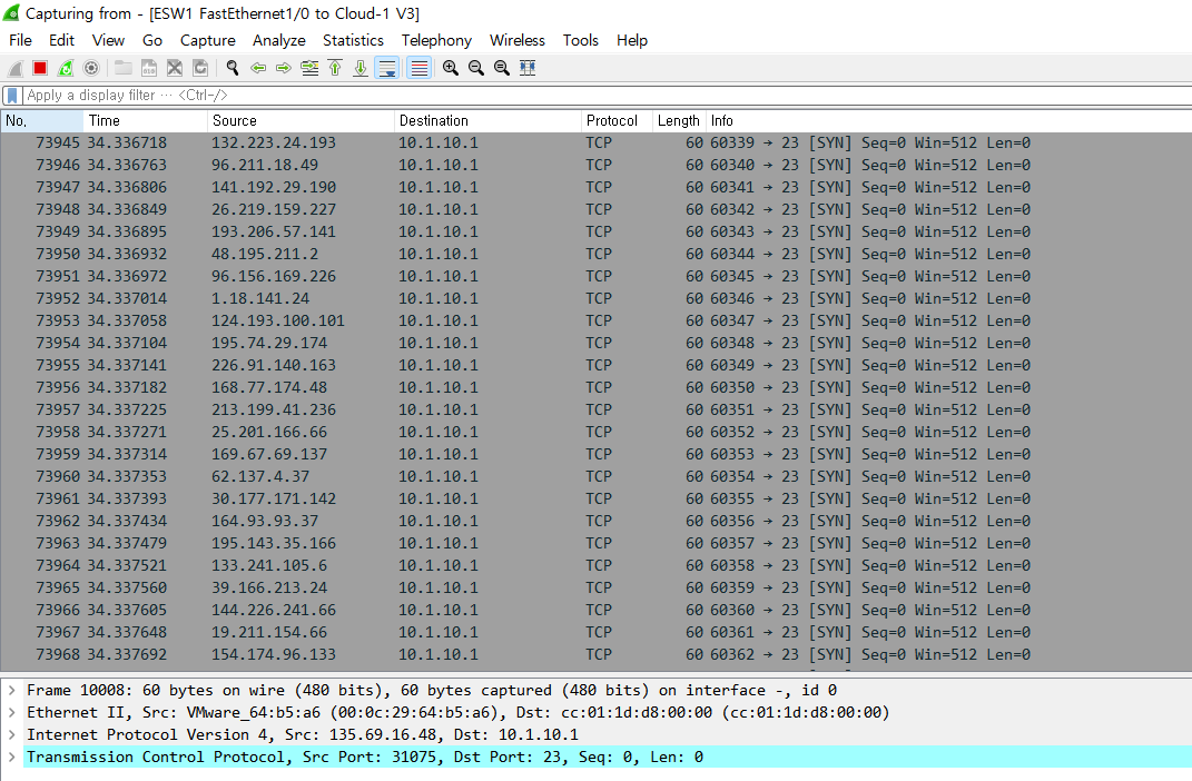 패킷들을 확인해보면 source address가 바뀌며 10.1.10.1에게 23번 포트로 패킷을 무한정 보내게된다