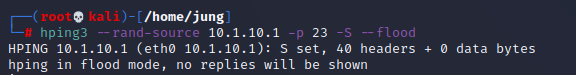 kali에 hping3를 이용하여 source address를 랜덤으로 바꿔가면 스위치에 vlan주소인 10.1.10.1로 패킷을 23번 포트(telnet)으로 flooding 한다.