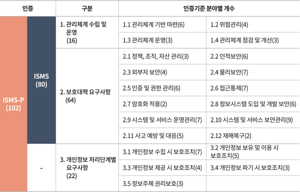 참고: 개인정보 영역을 제외하고 '정보보호 관리체계'만 인증받는 ISMS(80개 항목) 인증도 존재합니다.