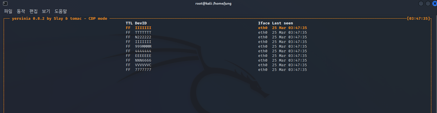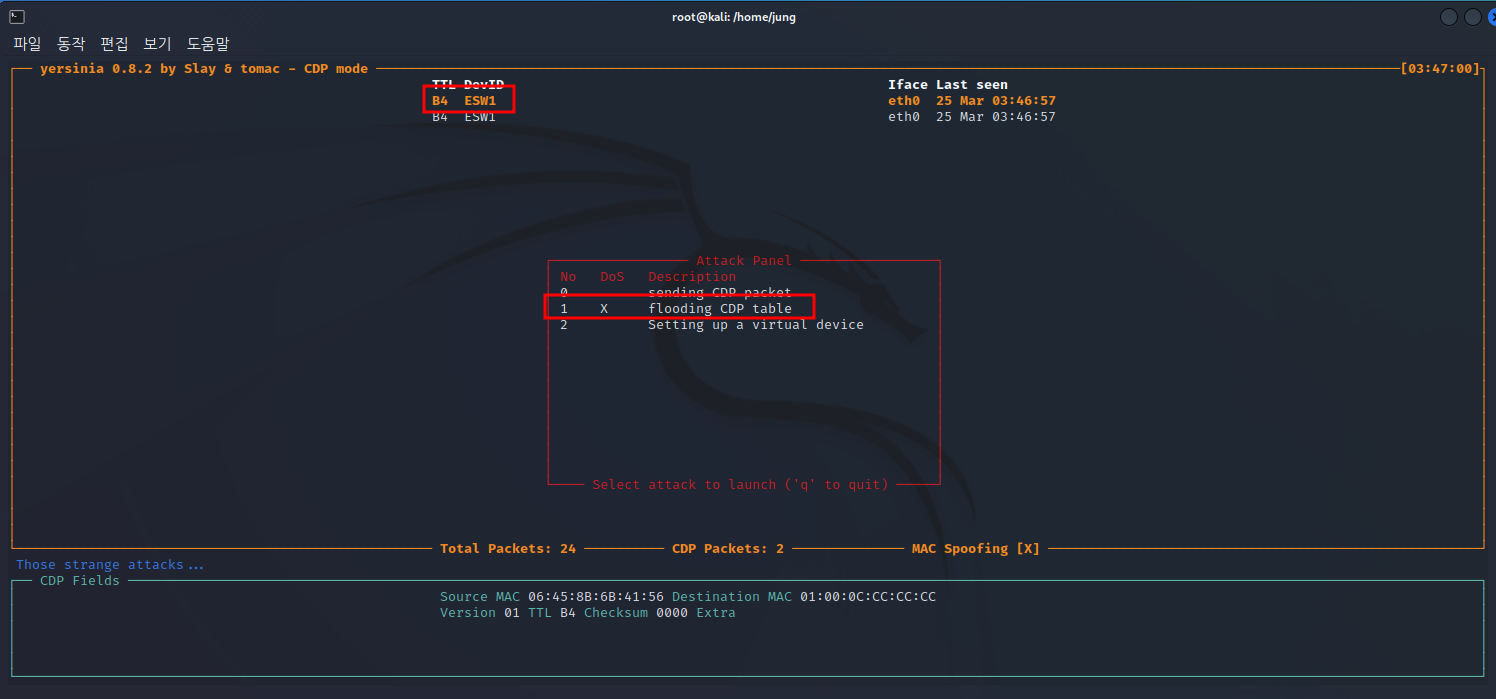 kali yersinia 툴을 이용해 cdp flooding attack을 한다.