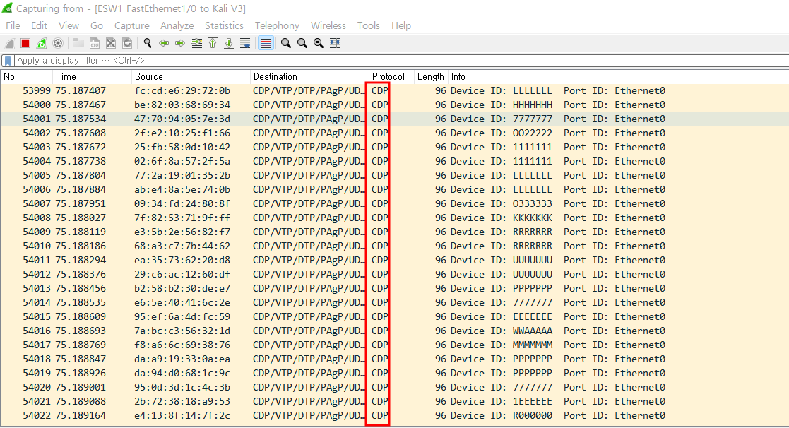 Wireshark를 통해 패킷을 캡쳐해보면 대량으로 CDP 패킷이 전송되는것을 확인할 수 있다.